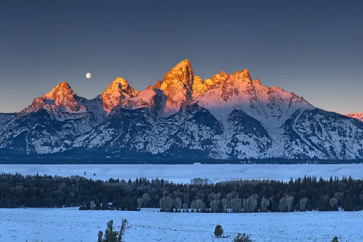Our sunset tour is after lunch for stunning sunset colors. Your knowledgeable guide takes you on a tour of the wildlife hotspots, starting in the National Elk Refuge. Here, you have a chance to see bighorn sheep scaling snowy cliffs, possibly even up-close as they cross your path, and thousands of elk wintering in a herd. The journey continues through Grand Teton National Park at our favorite photograph and animal viewing locations, so bring your camera!